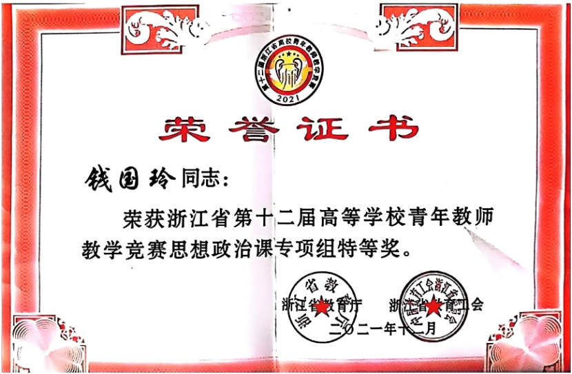 钱国玲,法学博士,现德法教研室教师,讲授《思想道德与法治》、《医学伦理学》等课程。其中,《思想道德与法治》入选伟德国际bevictor官方网站2022年度校级“一流本科课程”,《医学伦理学》入选2022年省级课程思政示范课,校级思政教育精品育人工程。先后在《浙江大学学报》、《人大复印报刊资料》、《现代出版》等期刊发表论文10余篇,出版专著1部、编著1部、参编省级规划教材1部。主持省部级课题2项、校级课题5项。