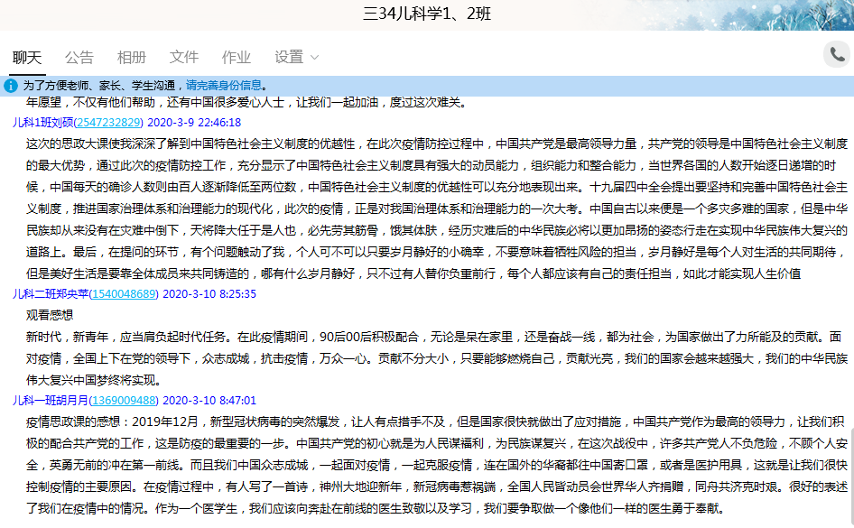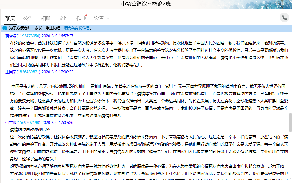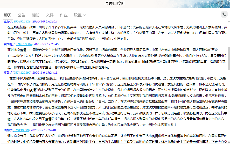 虽然突如起来的疫情打乱了师生们的正常生活,但这堂大课让大家从中找到了答案,也印证并坚定了自己内心的认识。有以习近平同志为核心的党中央坚强正确的领导和中国特色社会主义制度的显著优势和全国人民的万众一心众志成城,中国必能战胜疫情,迎来春暖花开。