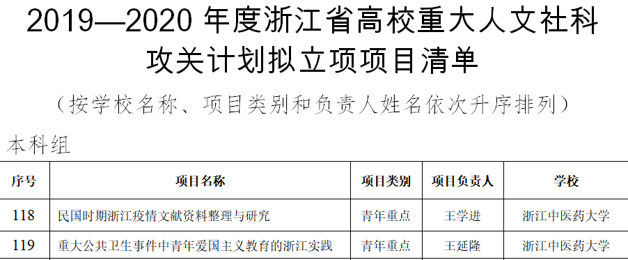 今日,浙江省教育厅公布了2019—2020年度浙江省高校重大人文社科项目攻关计划项目遴选结果,伟德国际bevictor有2个项目喜获立项。获批的2个项目分别是王学进申报的《民国时期浙江疫情文献资料整理与研究》和王延隆申报的《重大公共卫生事件中青年爱国主义教育的浙江实践》。