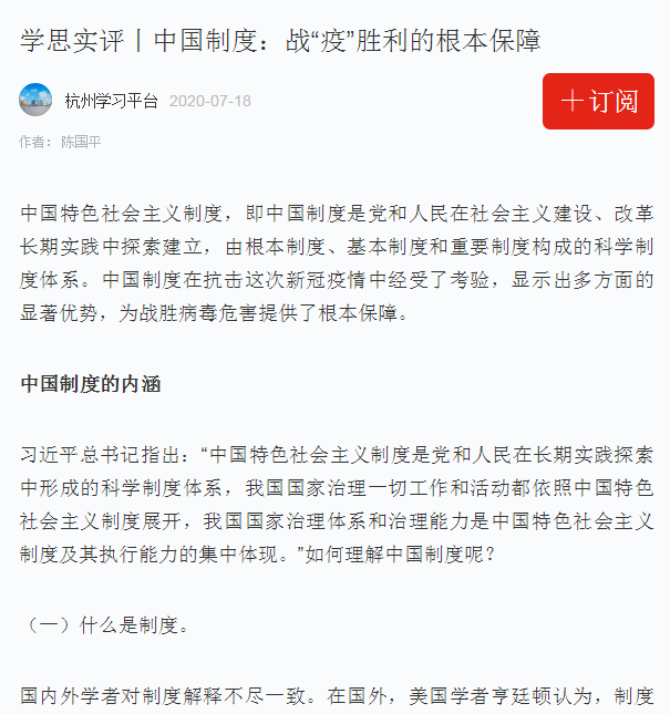 近日,公司陈国平老师所撰文章《中国制度:战“疫”胜利的根本保障》为学习强国杭州学习平台“学思时评”专栏收录。