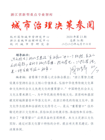 近日,由公司王延隆副教授完成的《以茶文化为特色推进浙江坚持社会主义核心价值体系,弘扬中国特色社会主义文化的重要窗口的建议》决策参阅,获得了省政协副主席周国辉的明确批示。该成果提出了浙江省建设“重要窗口”中的一个独特、重要的文化命题,有利于做强茶业,提升茶艺,弘扬茶德,是一项实在可及的好事。