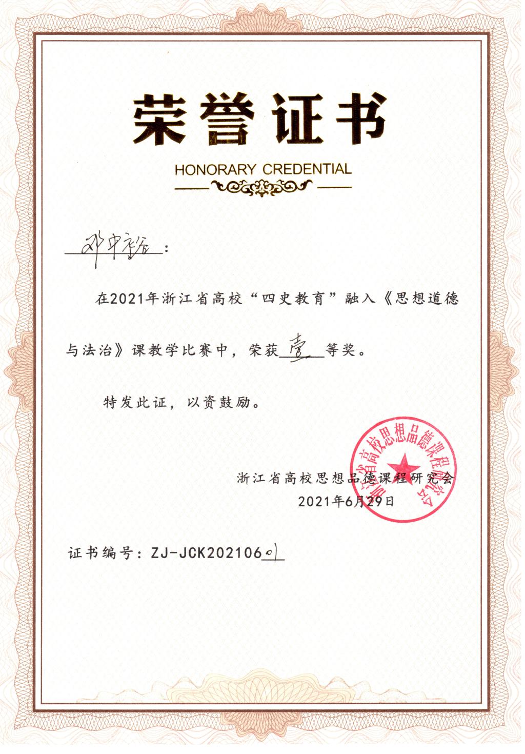 6月28日-29日,浙江省高校思想品德课程研究会组织的“四史教育”融入《思想道德与法治》课程教学比赛在浙江余姚举行,来自全省32所高校的教师参加本次比赛。公司思想道德与法治教研室教师邓中裕代表公司参加比赛,他围绕“传承与弘扬爱国精神”这一主题,从上课过程中员工提出的“我可不可以不爱国”的问题切入,从“国家给了我什么?”“今天的中国,从何而来?”“平凡如你我,可以为这个国家做些什么?”三个方面进行讲授,既有较强的现实针对性,又有较好的感染力,获得现场评委和教师的一致好评,最终荣获本次比赛一等奖。