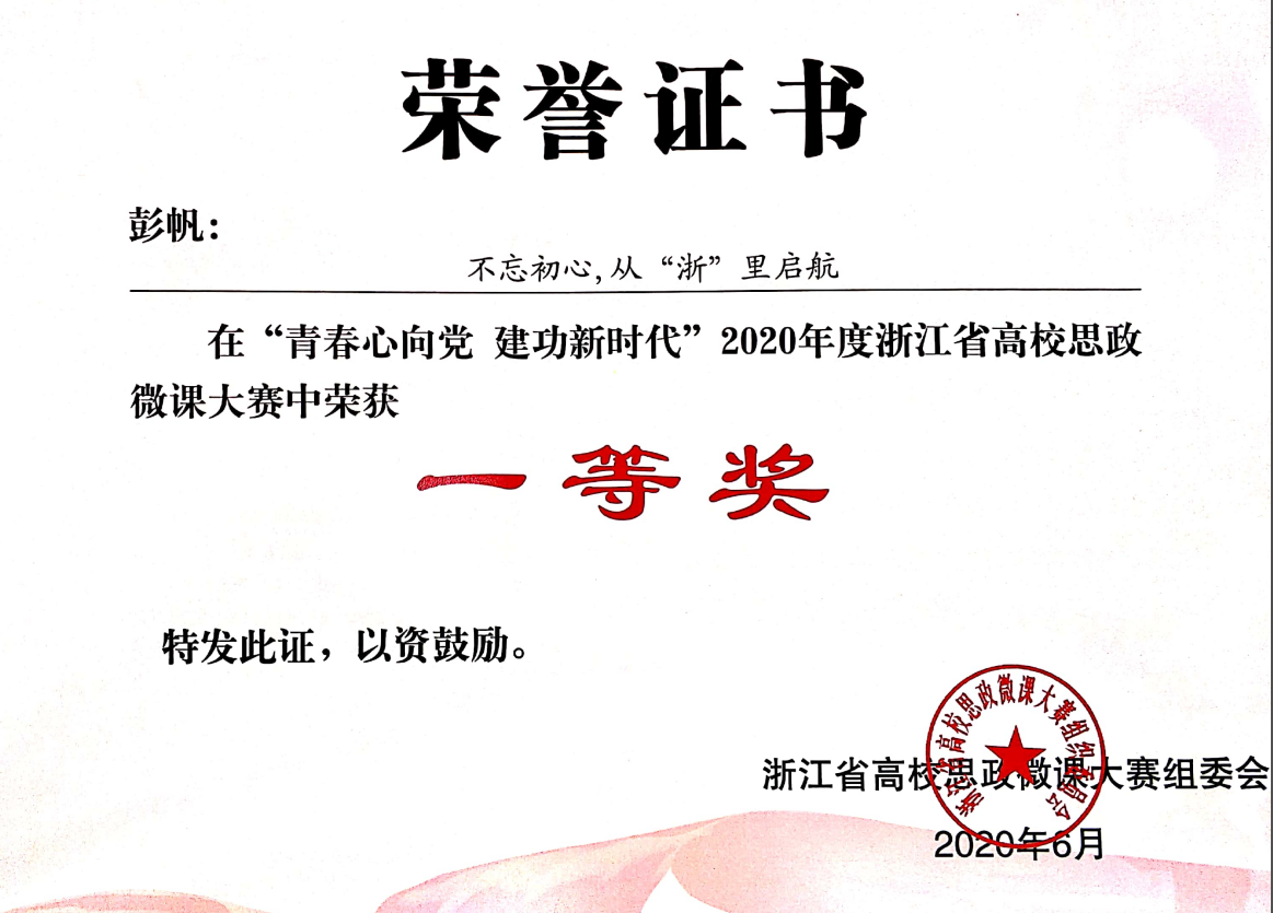 彭帆,女,江苏徐州人,1989年8月生,讲师,浙江大学访问学者,主要研究方向为马克思主义中国化。曾主持和参与省部级课题、厅局级课题和校级课题十余项,发表论文数篇。曾指导员工获得省部级学科竞赛一等奖、二等奖、三等奖等数项。曾任员工班主任、员工辅导员数年,有较为丰富的员工工作经验。曾被评为校级优秀教师、校级优秀班主任,个人事迹曾被公司官方微信专题报道。曾代表公司参加浙江省微党课大赛并获得一等奖,获得“浙江省优秀宣讲员”荣誉称号,并作为宣讲团成员到各地参与巡讲。