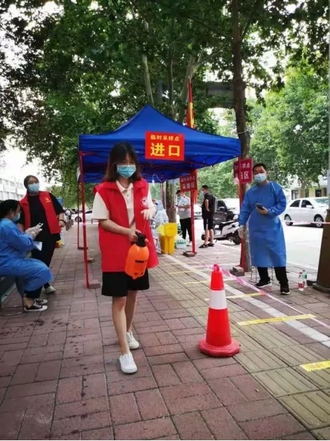 “您好!请您配合我们测量体温,并扫码登记”;“请您准备好身份证”;“我来帮您登记信息”;“请大家保持好距离、注意防护。”身着红马甲的张馨予同学“疫”无反顾,在炎炎烈日下,认真尽责地协助值守人员对来往行人、车辆逐一进行测量体温、查验健康码和行程码、身份证扫描、秩序维护等,并积极做好疫情防控政策措施和防护知识宣传,成为社区疫情防控一线的一名服务骨干。