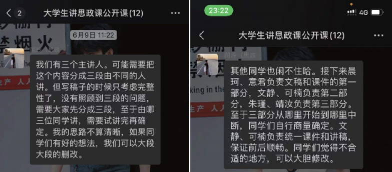 授课团队《逆火光而行奉青春,顺人生目标创价值》,由邓中裕老师和朱耿华老师共同指导,医学检验技术专业陈喆喆同学作为第一主讲人。课程以身边人和事作为切入点,通过普通人真实的生活经历生动讲述了人生价值实现及其评判过程中需要注意的若干问题。同时,两位老师还指导了另一个授课团队《坚持依法治国和以德治国相结合》,由口腔医学专业林程奕同学作为第一主讲人。团队从经典和热点案例切入,通过教学互动深入浅出地阐述了在建设社会主义法治国家的过程中,为什么要坚持依法治国与以德治国相结合。